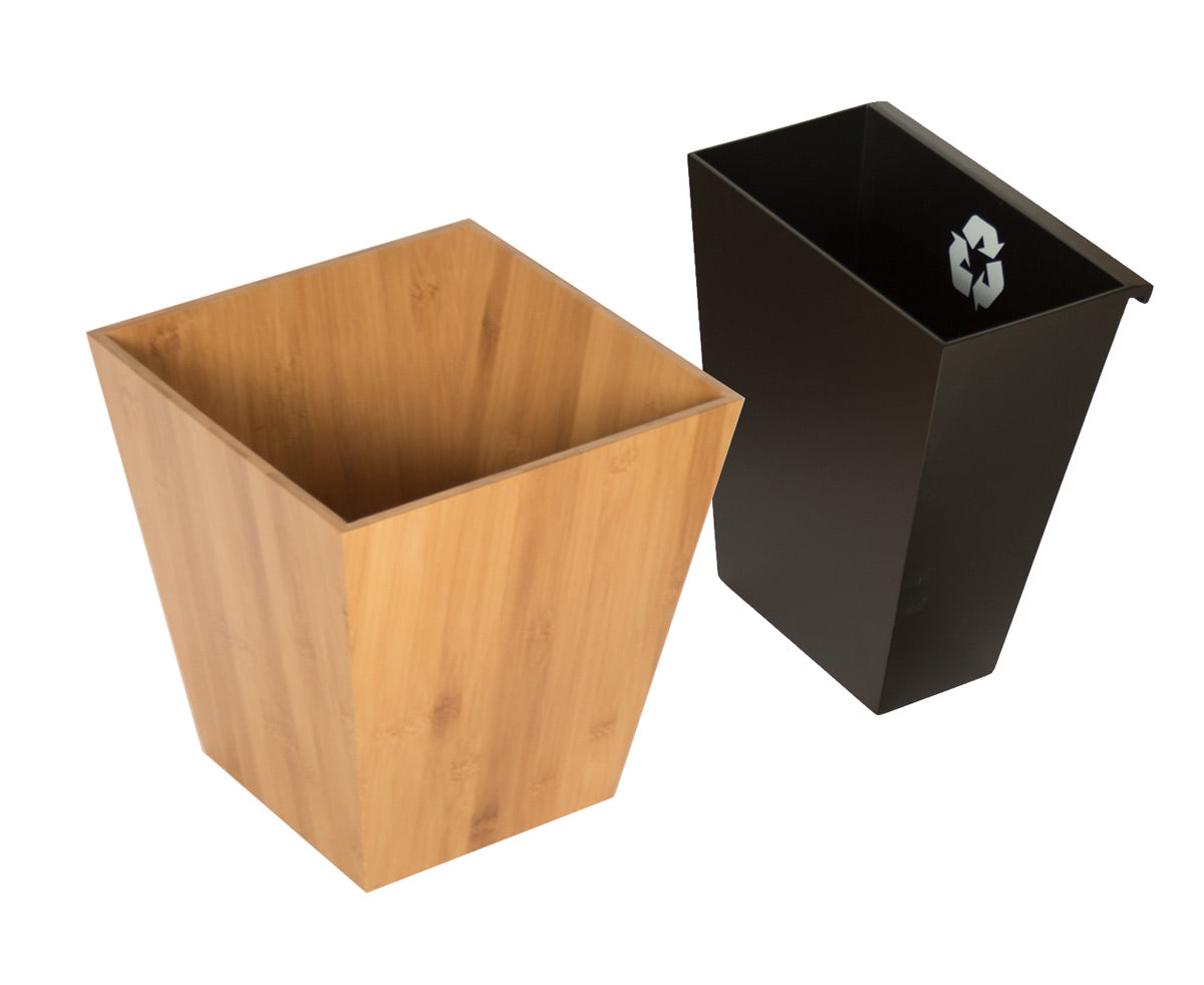 Our bamboo waste bin has a painted MDF insert for recyclables. "Recycle" words or icon can be silkscreened onto unit. 10" x 10" 10.5"H