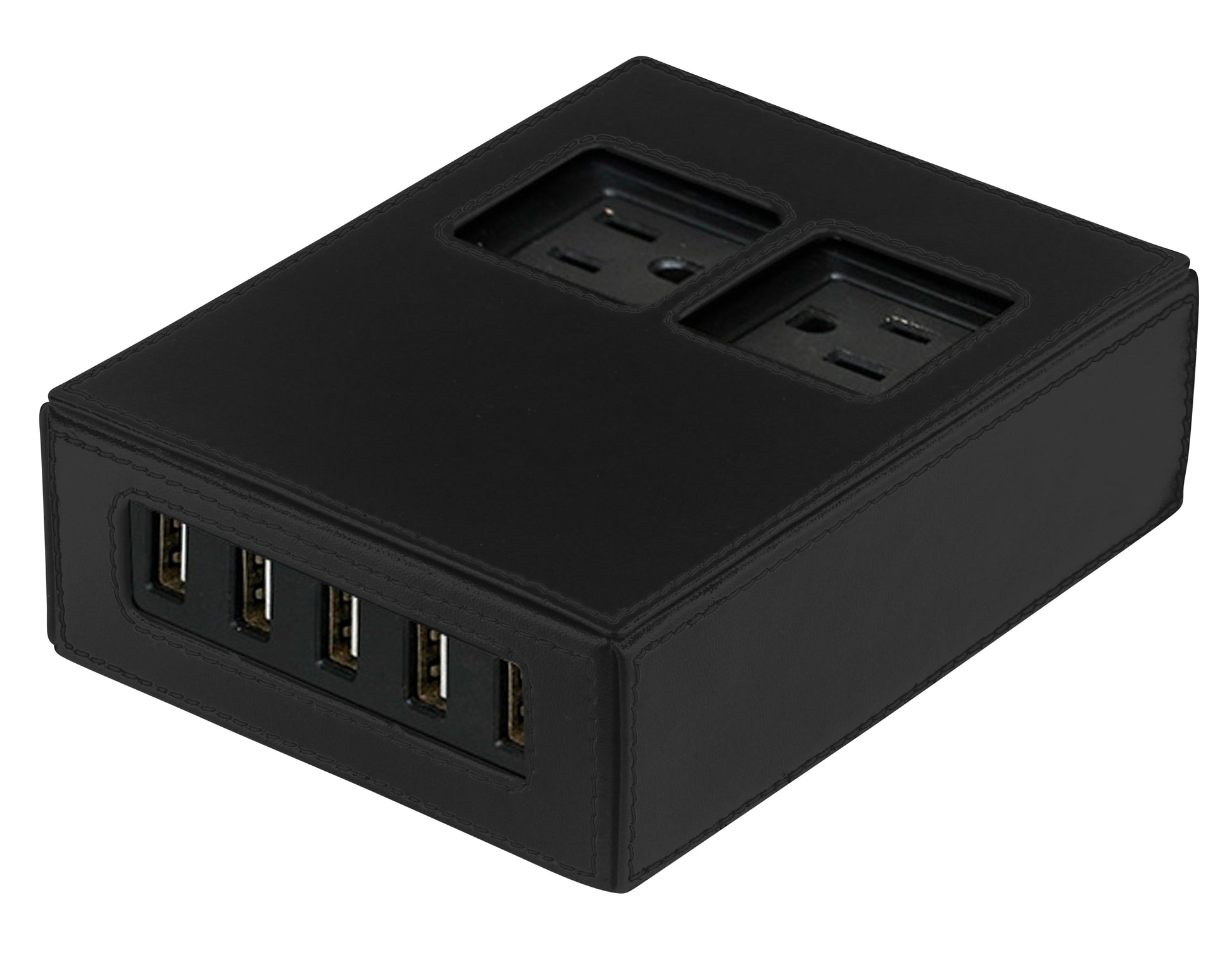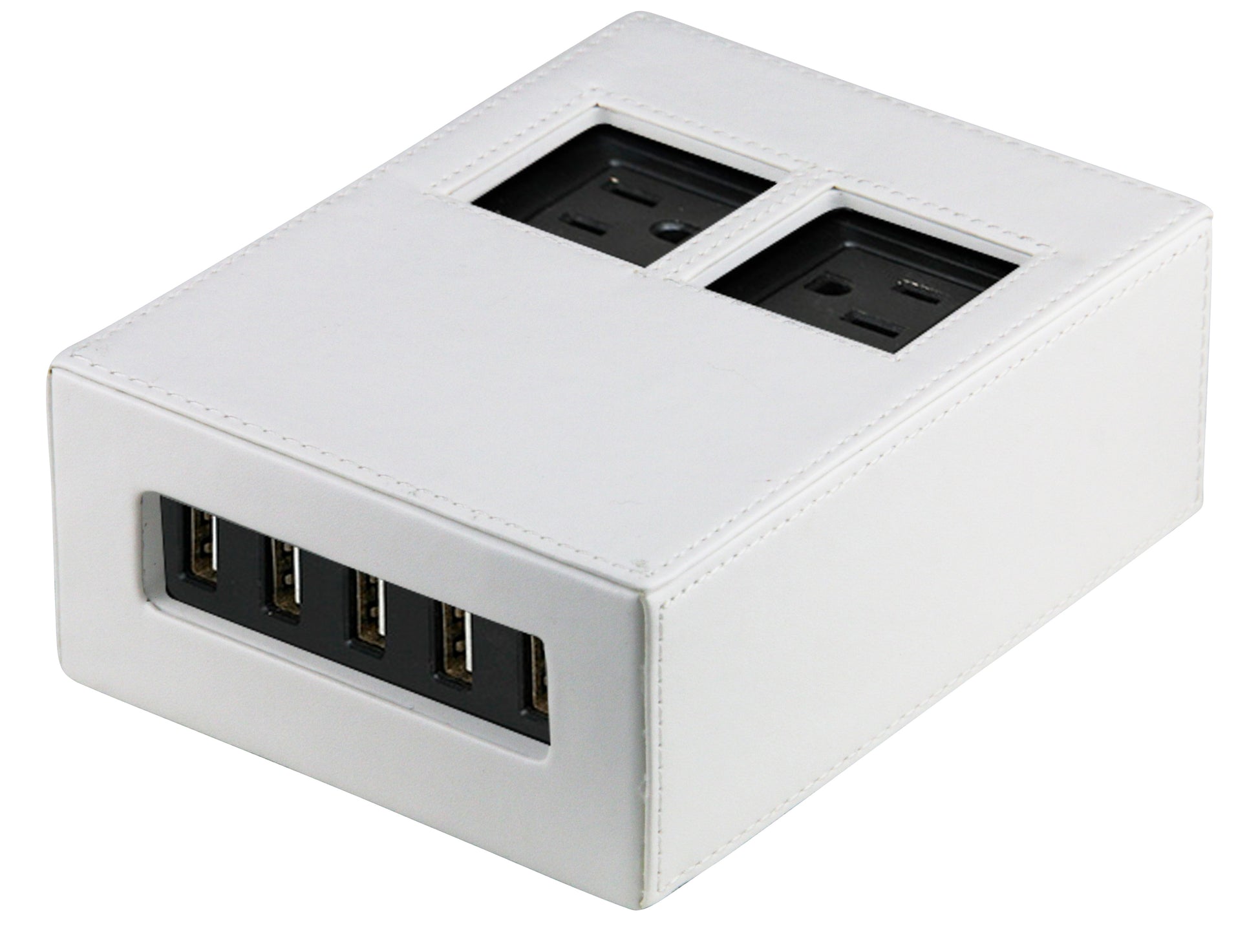 - Power With An Innovative And Unique Design -- Our patented design packs a lot of power into your hotel nightstand or desk with 5-USB Ports and 2-AC Ports. Plug in laptops, desk lamps, etc. into the 2-AC Ports in the back and all your other smaller devices into the 5-USB Ports in the front. Turn ugly plastic power strips into a visually pleasing alternative to standard, utilitarian power strips.